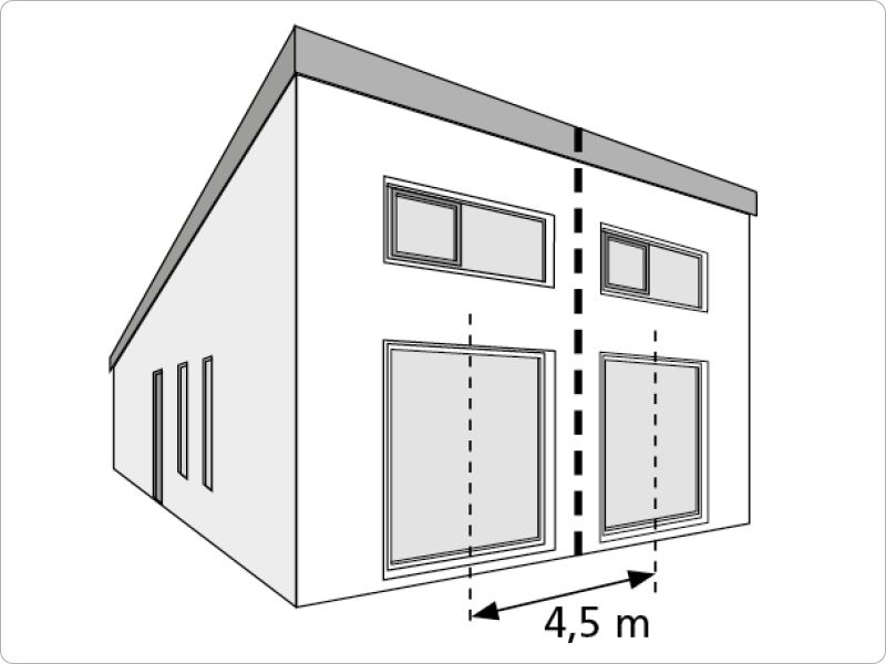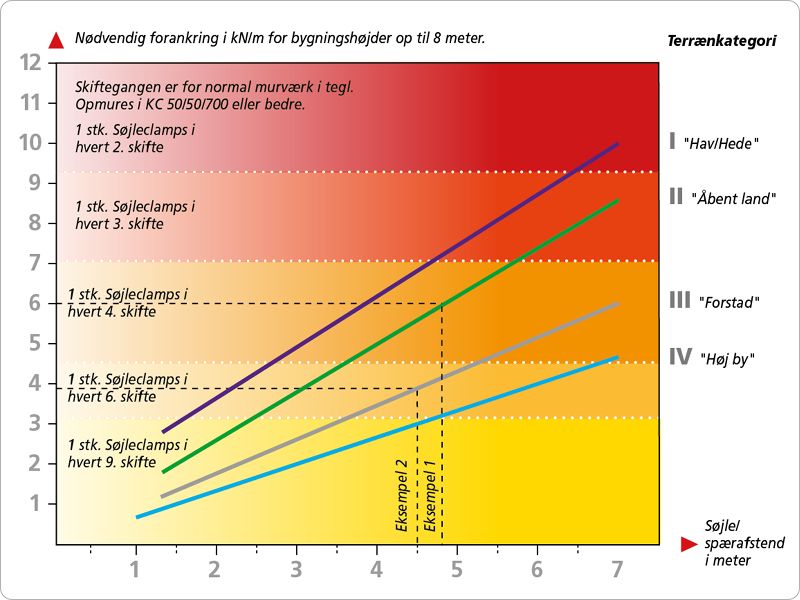 Eksempel 2: Enfamiliehus i forstadsområde (Terrænkategori III), hvor facaden skal stabiliseres af en stålsøjle. Med et lastopland på 4,5 m, skal murværket forankres til søjlen med 3,8 kN/m, hvilket opnås med 1 stk. Søjleclamps i hvert 6. skifte.