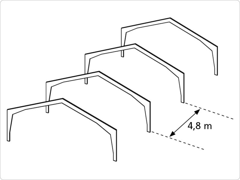 Eksempel 1: Lagerhal i åbent land (Terrænkategori II). Rammeafstand er 4,8 m. Lagerhallen skalmures og murværket skal forankres til rammerne med 6,0 kN/m hvilket opnås med 1 stk. Søjleclamps i hvert 4. skifte.